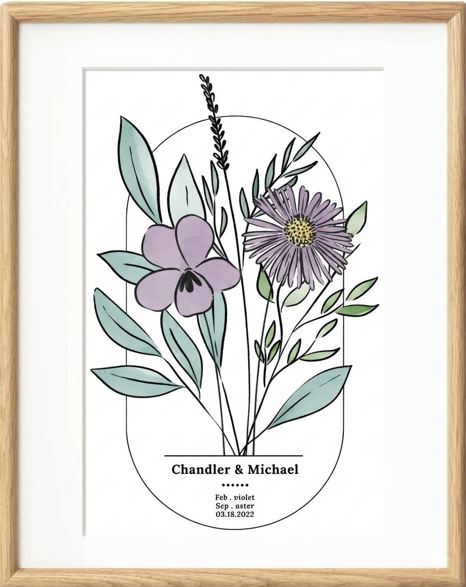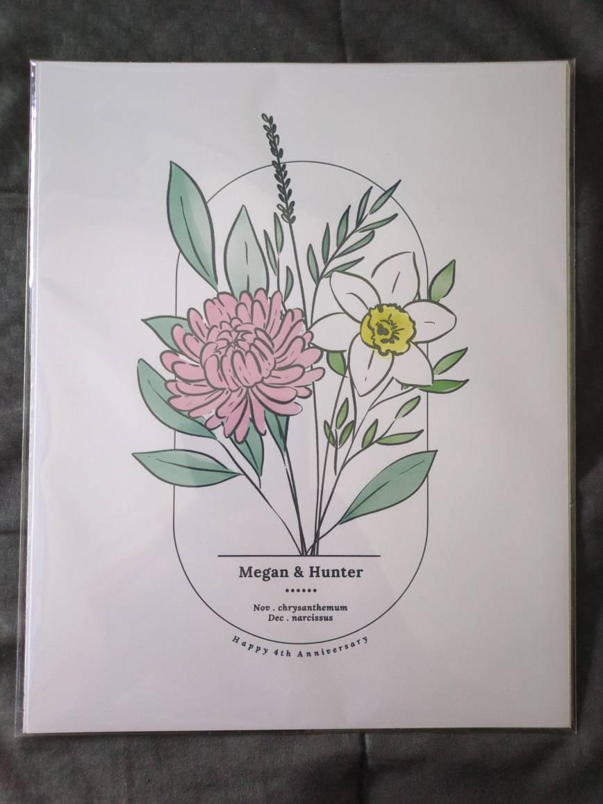 The traditional gift for a 4th anniversary is flowers, and this personalized birth flower print is a meaningful way to honor that tradition. Want to add your anniversary date? I can do that too!