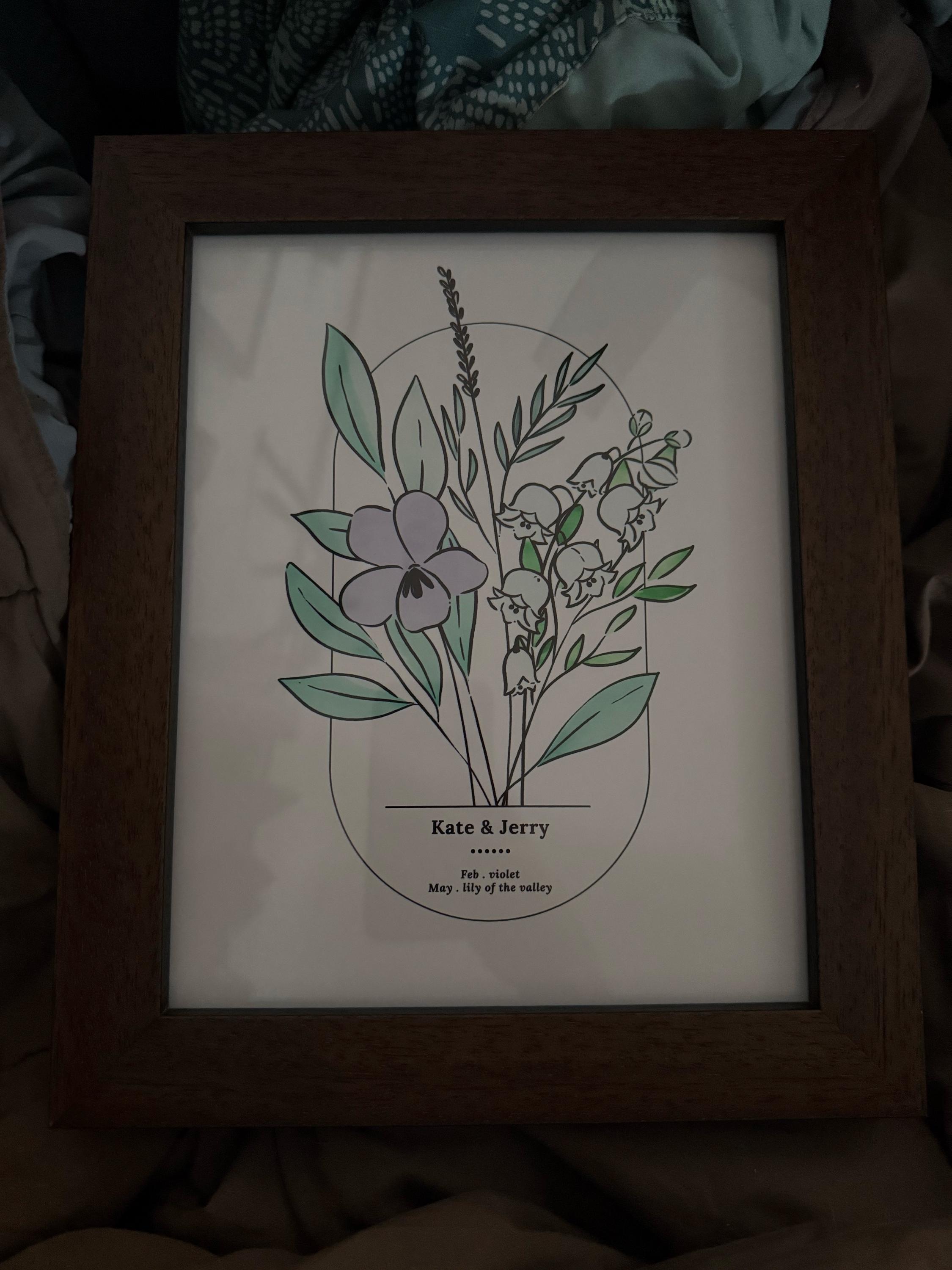 2 Flower Personalized Bouquet Print. Perfect for 2; wedding couples, anniversary gifts, mom or grandma of 2. One of a kind piece illustrated by Me, Jande Summer.